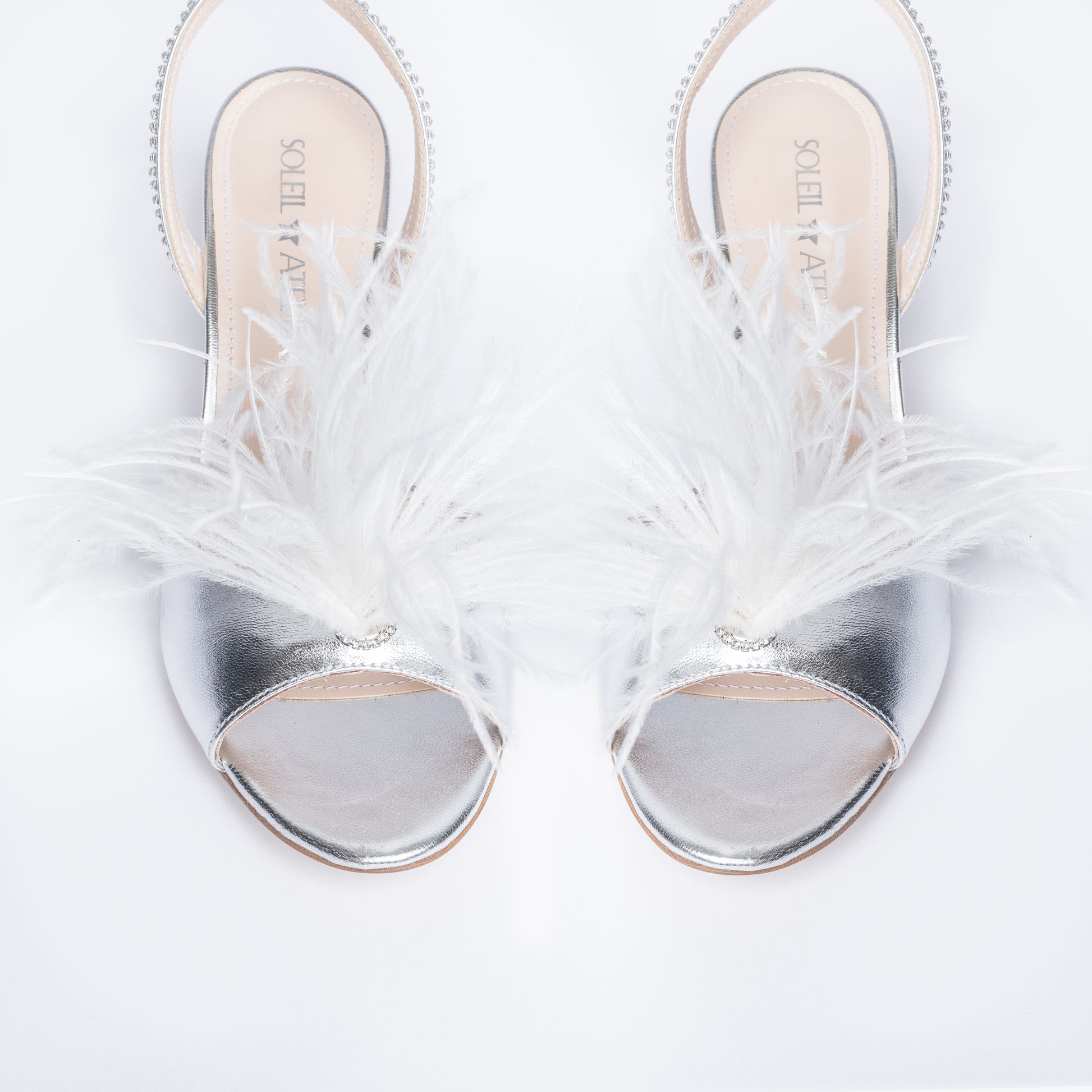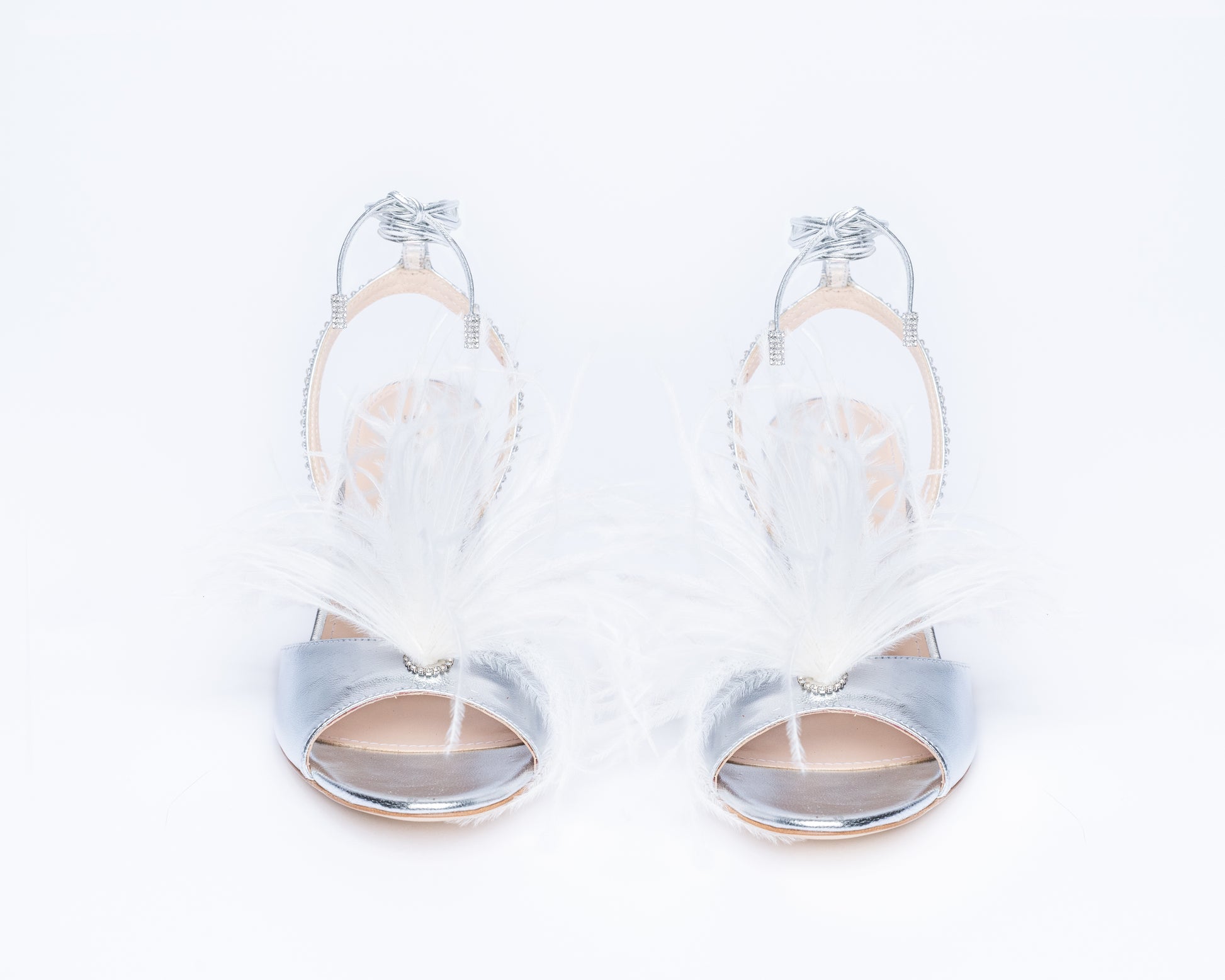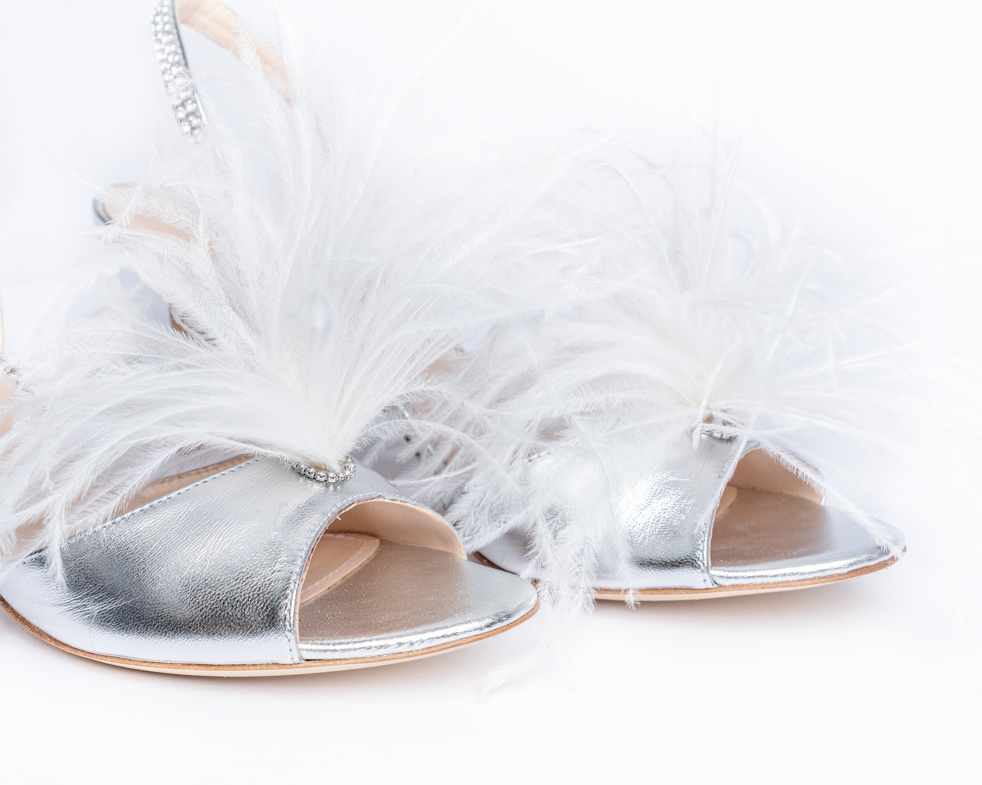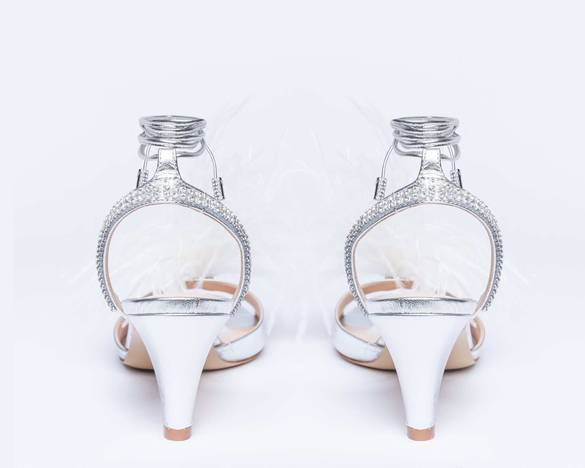 Feminine glamour wrap around the ankle ties. Glittering light reflecting rhinestones on toe strap and heel strap. Attention to detail with jewel tassels finishing the adjustable ankle strap ties The FANCY SILVER ankle strap. Crafted in Italy from statement silver metallic leather, features slender straps and a modern toe. Make a statement day or night.