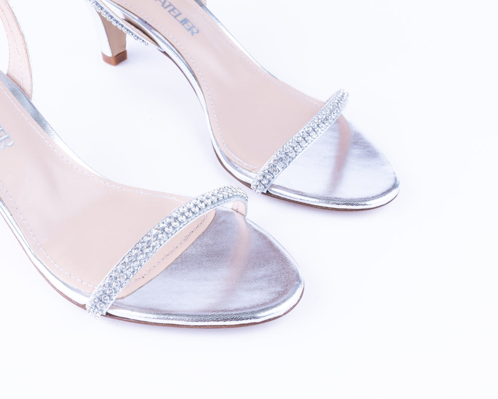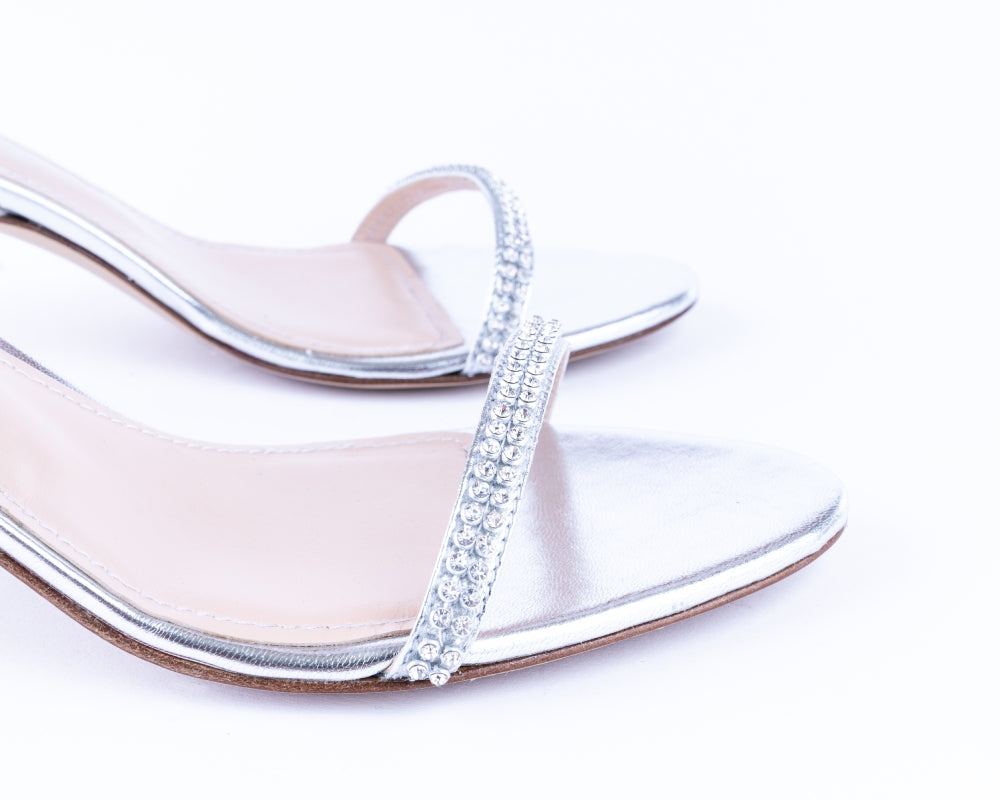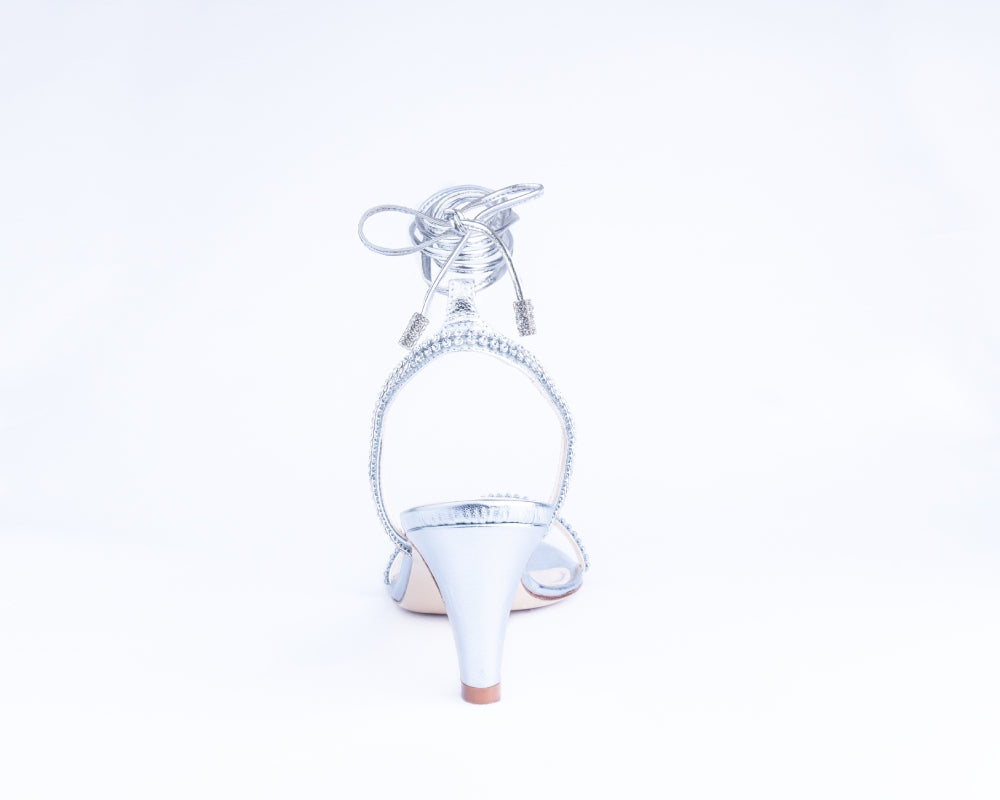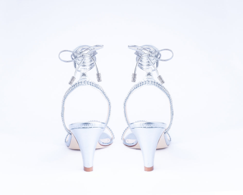 Feminine glamour wrap around the ankle ties. Glittering light reflecting rhinestones on toe strap and heel strap. Attention to detail with jewel tassels finishing the adjustable ankle strap ties The SKY SILVER ankle strap. Crafted in Italy from statement silver metallic leather, features slender straps and a modern toe. Make a statement day or night.